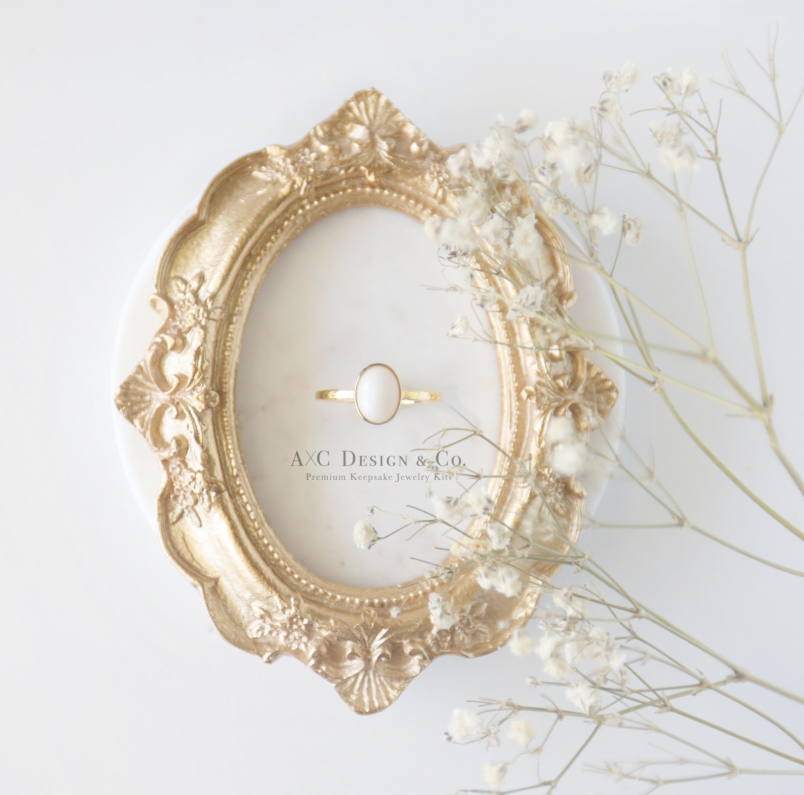 Create your own breastmilk jewelry at home with our Minimalist Oval Ring in solid 18K gold. This understated piece crafted with simplicity in mind, the oval design encapsulates the beauty of motherhood, creating a piece that is both meaningful and effortlessly stylish. Breastmilk stone size 6x8mm.